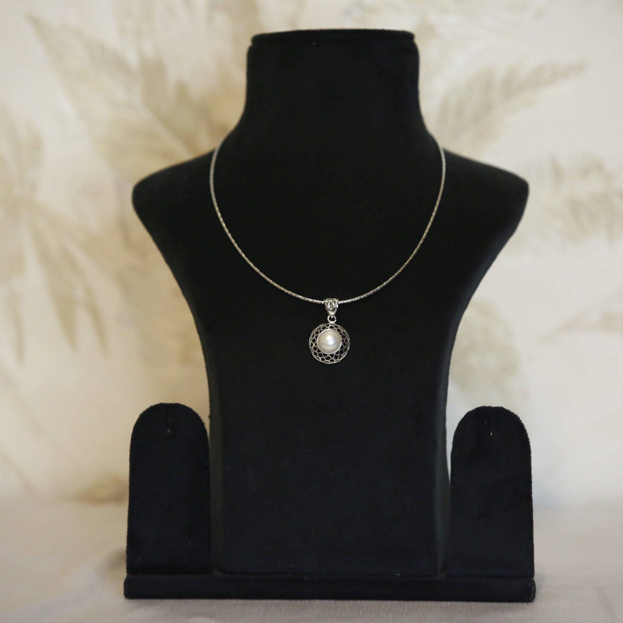 The circular pendant has a 10mm white button pearl in the center surrounded by jaali work.