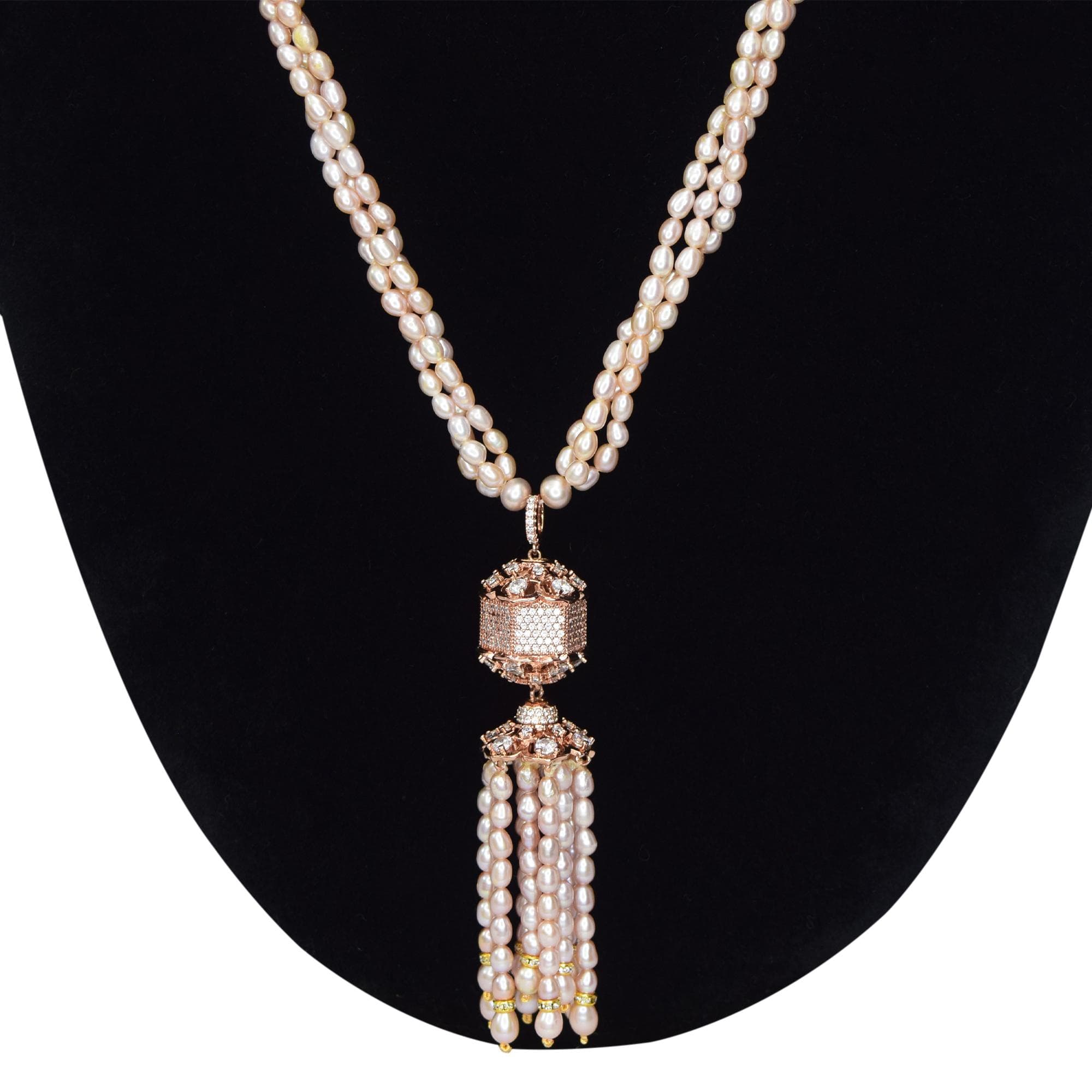 Pink Multi-Layer Oval Pearl Necklace With Zircon Pendant & Pearl Tassel