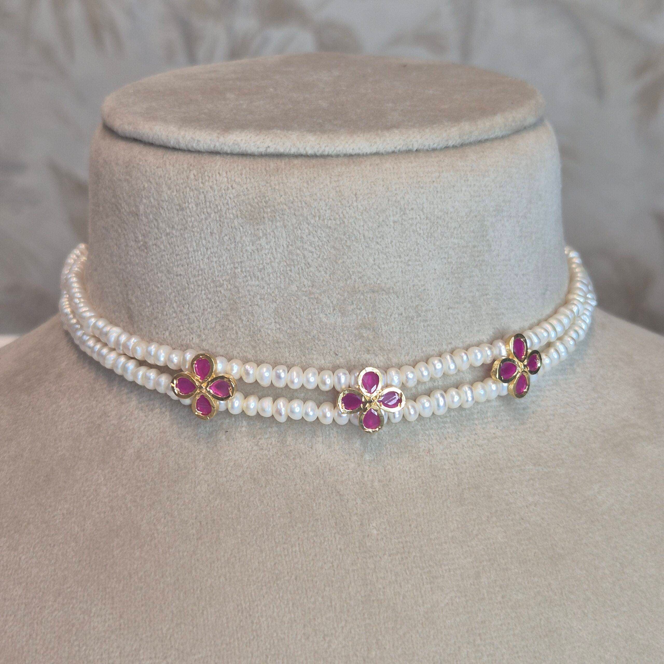 A beautiful handmade double-line choker made with shiny white roundish pearls accentuated by elegant SP ruby studded pendants.