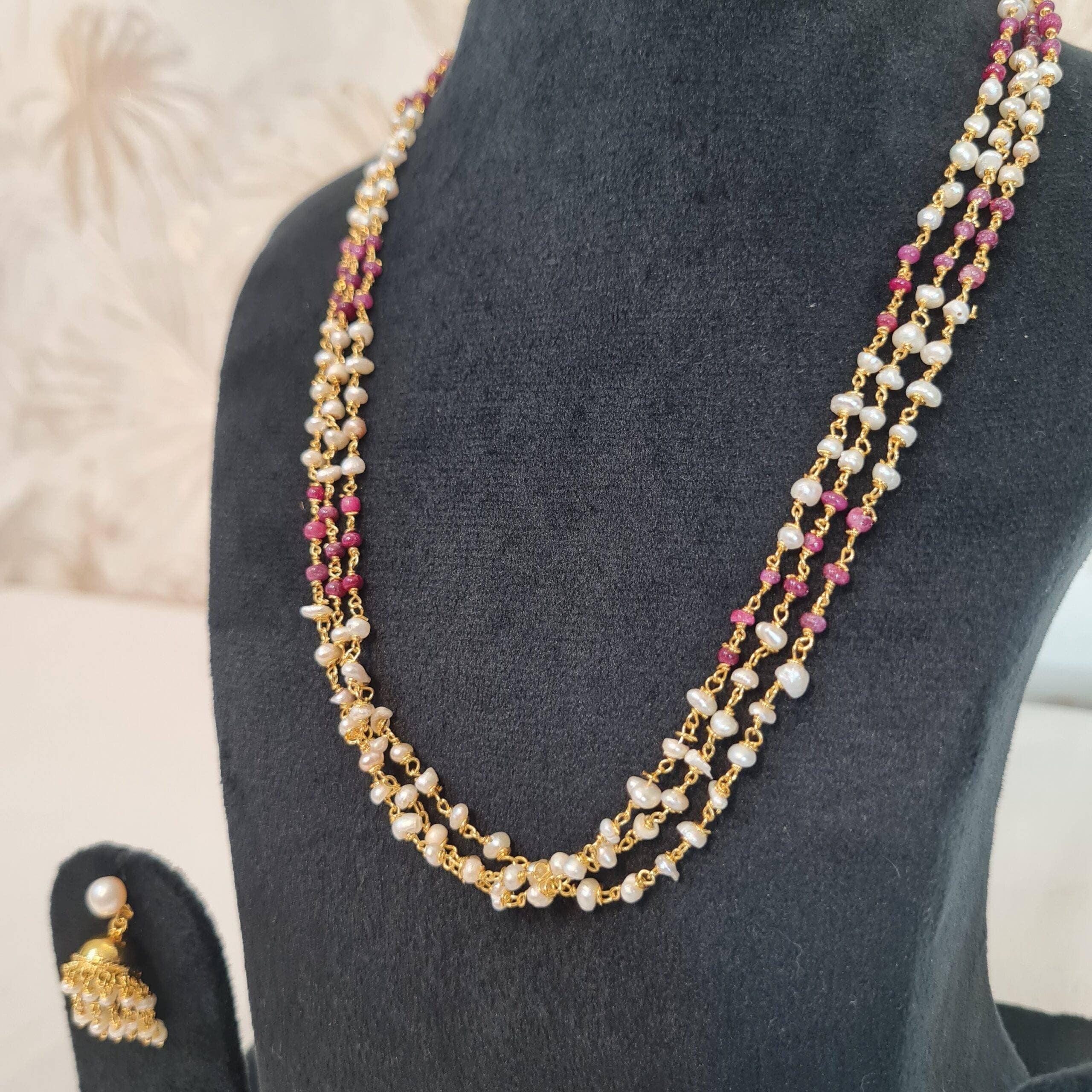 Pretty and Simple 3 Lines Taar Mala with Seed Pearls and Rubies