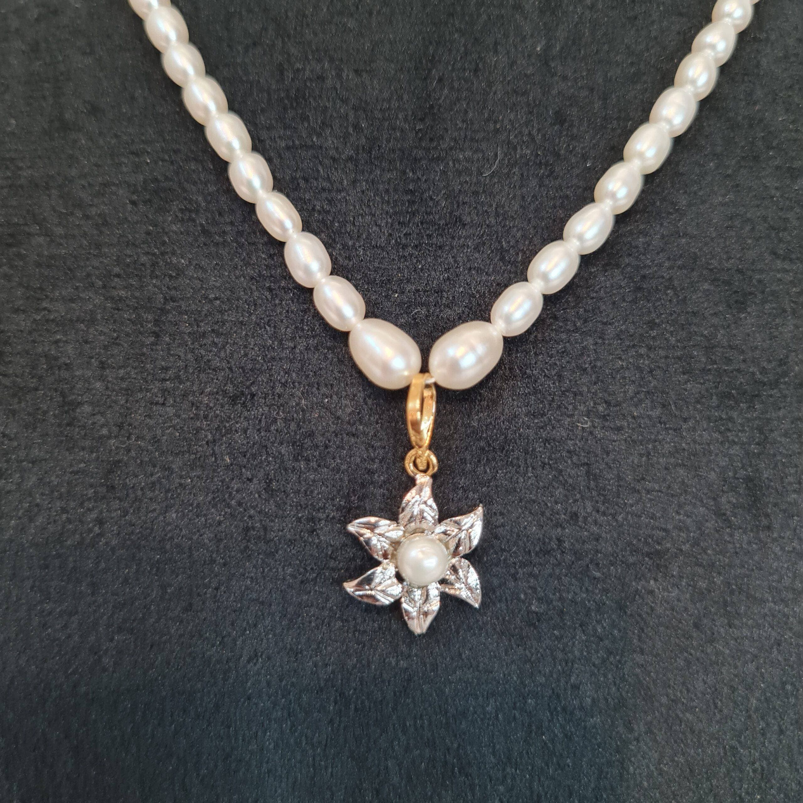 Pretty White Oval Pearl 15Inch Necklace With A Cute Floral Rhodium Finish Pendant