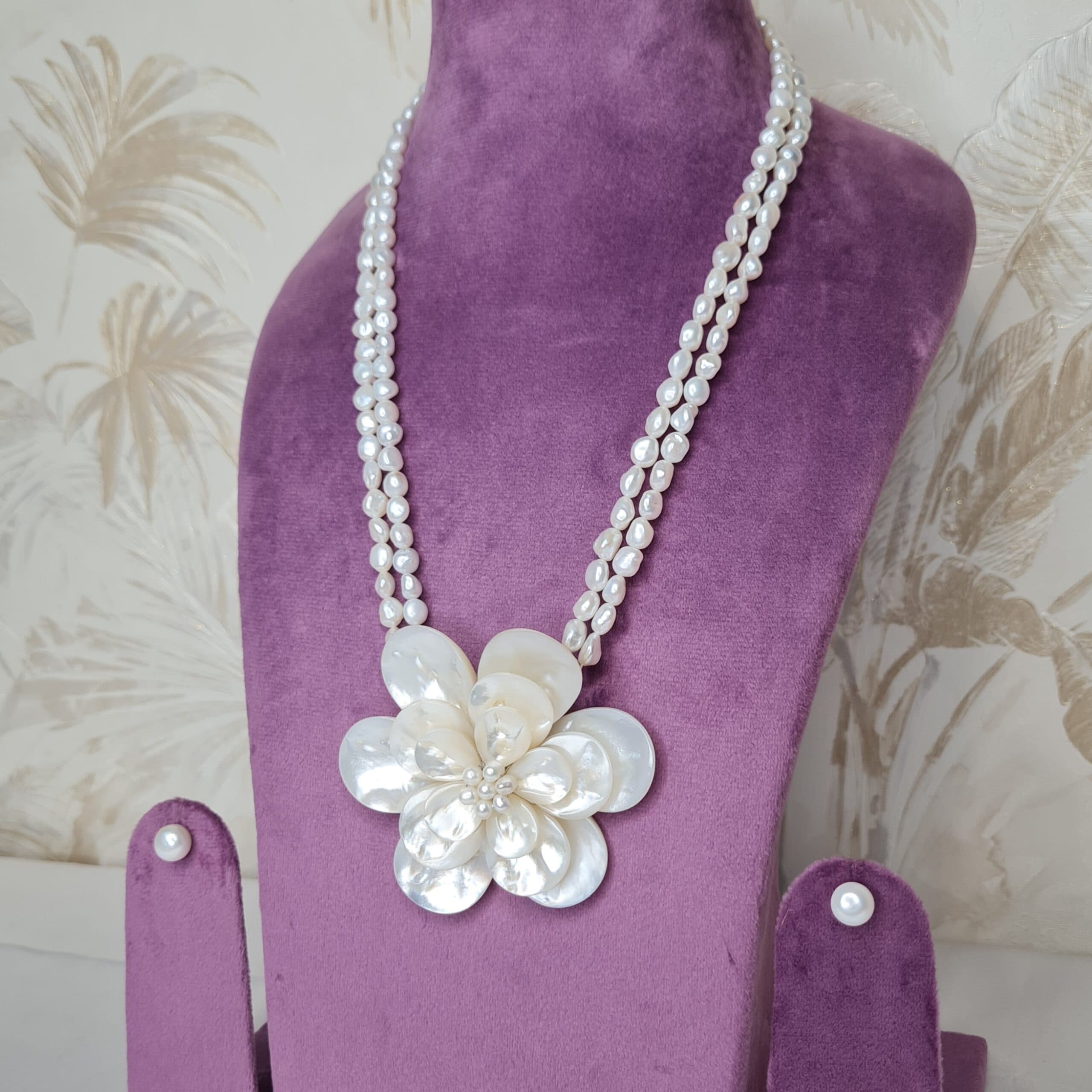 A beautiful 2-line necklace made out of the best white baroque pearls featuring a stunning Mother of Pearl flower-shaped pendant.