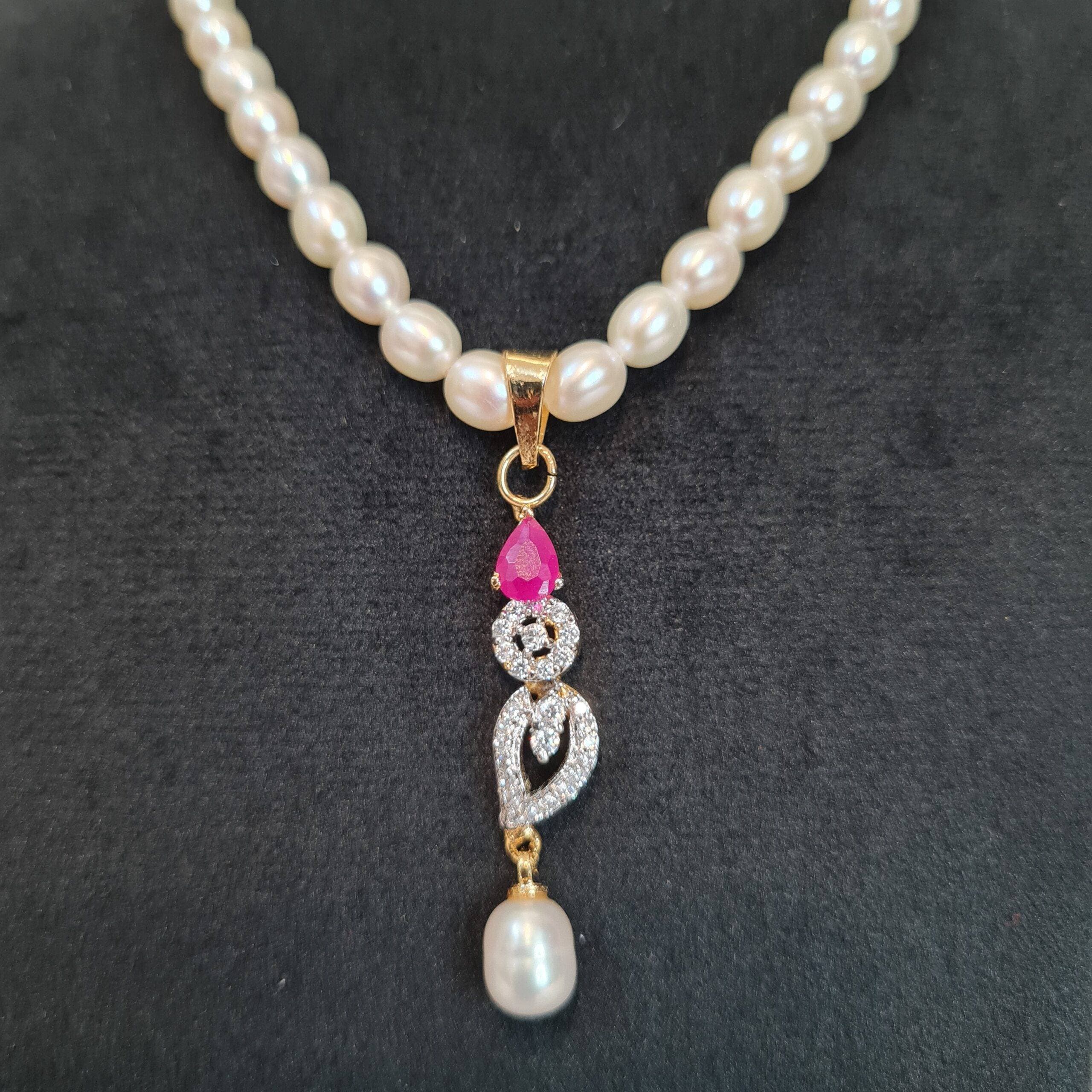 The necklace is a lightweight elegant pearl chain, & it features a golden finish clasp.