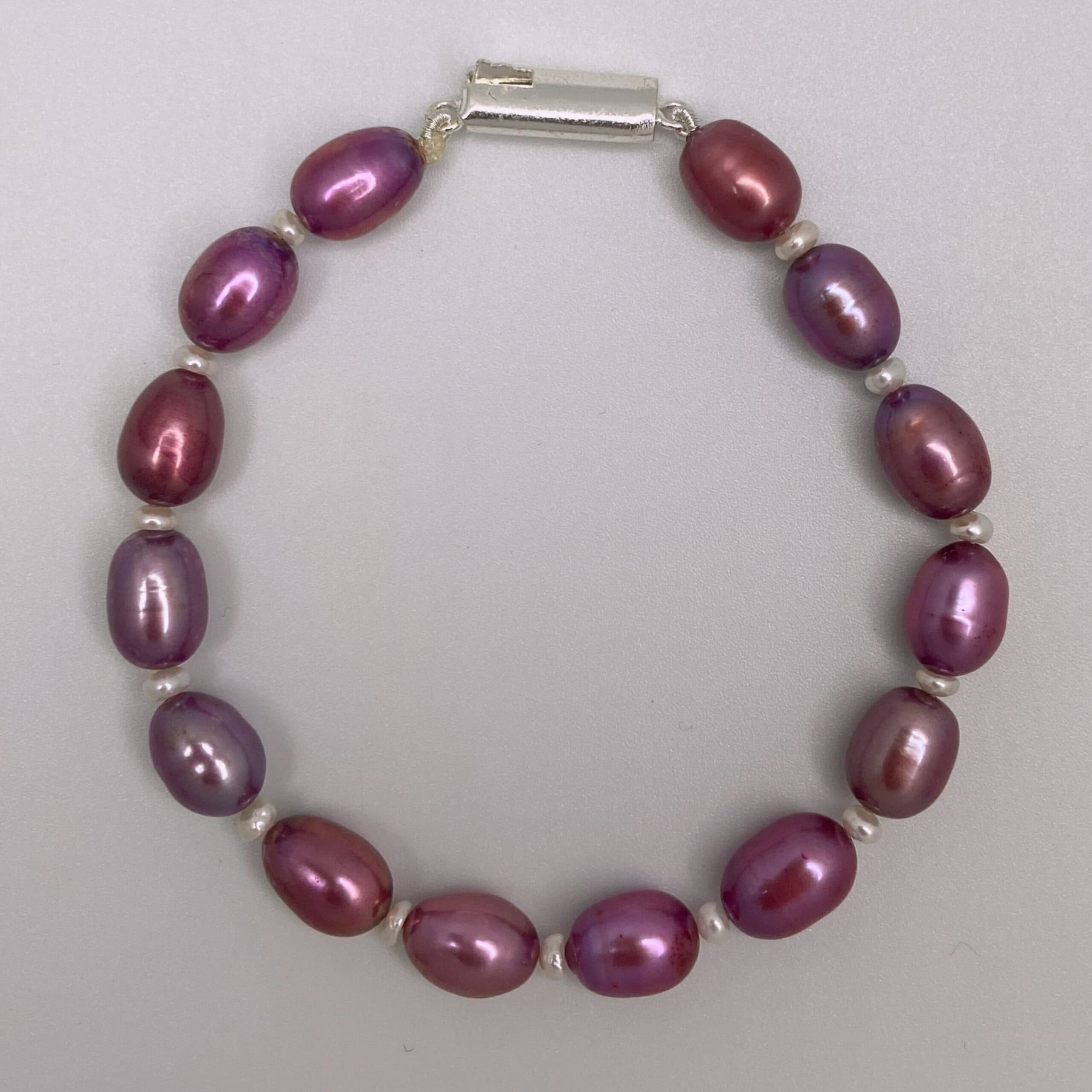 A well-crafted gorgeous 7.5mm oval bracelet in shades of magenta strung beautifully with white seed pearls in-between accentuated by a silver finish clasp.