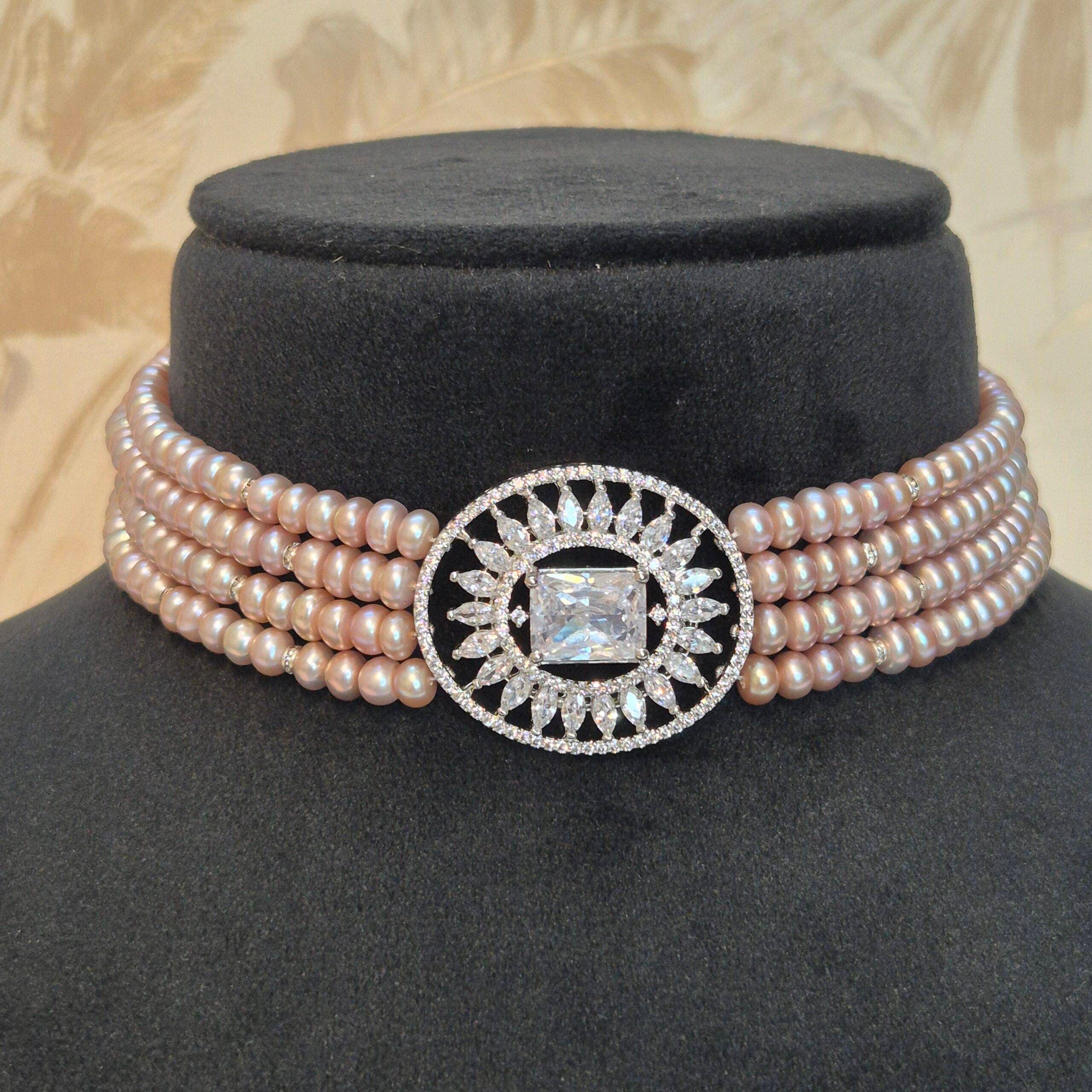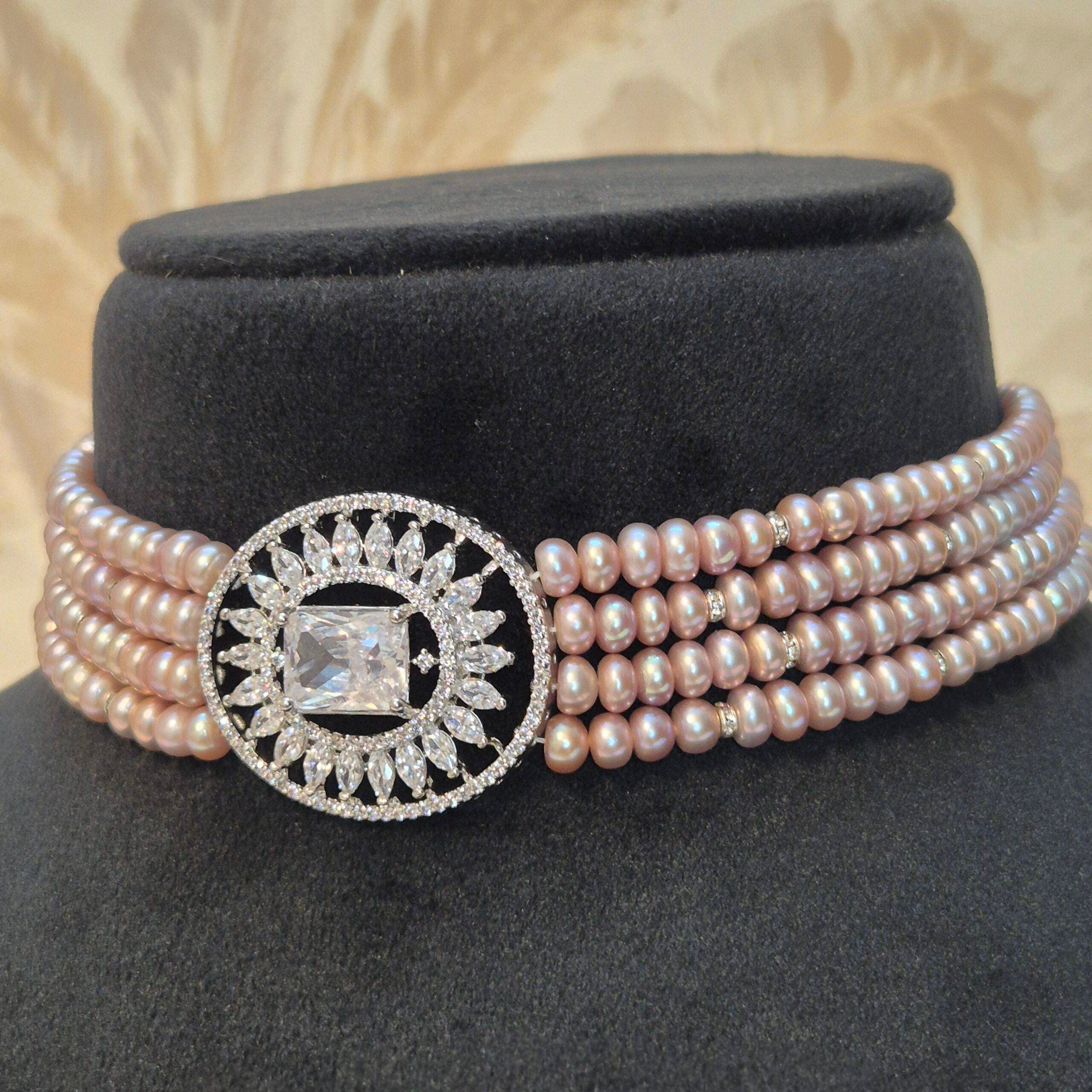 The choker features CZ studded roundels interspaced between the pearls.