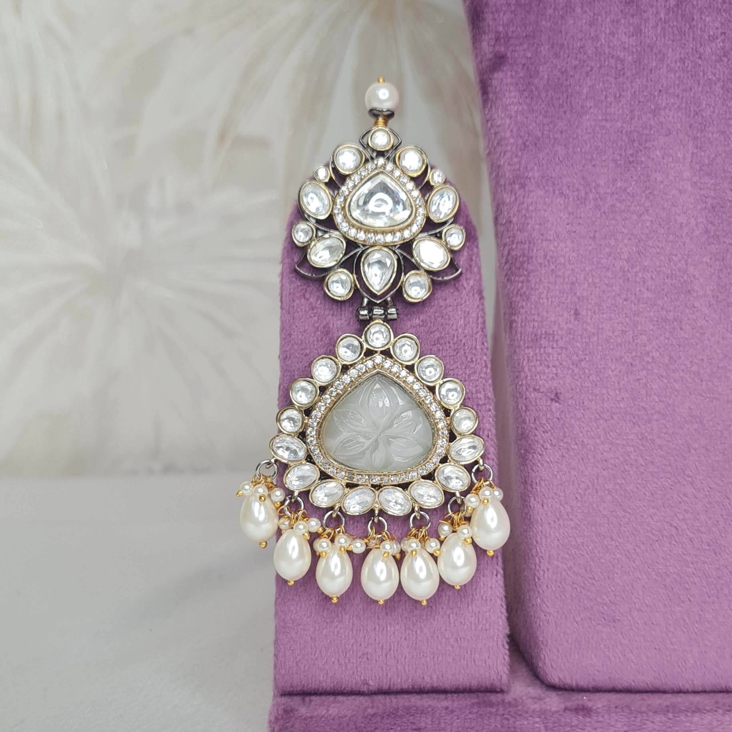 The large articulate pendant is studded with many shiny polki stones & has 7mm oval pearl droplets.
