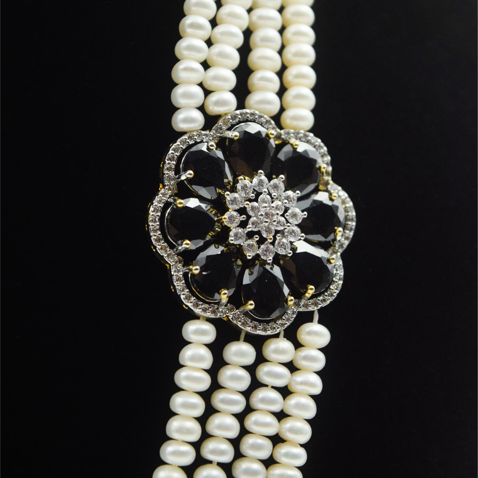 High-quality 25 Inches long four-row pearl haaram in white semi-round pearls featuring beautiful floral side pendants embellished with zircons & black onyx.
