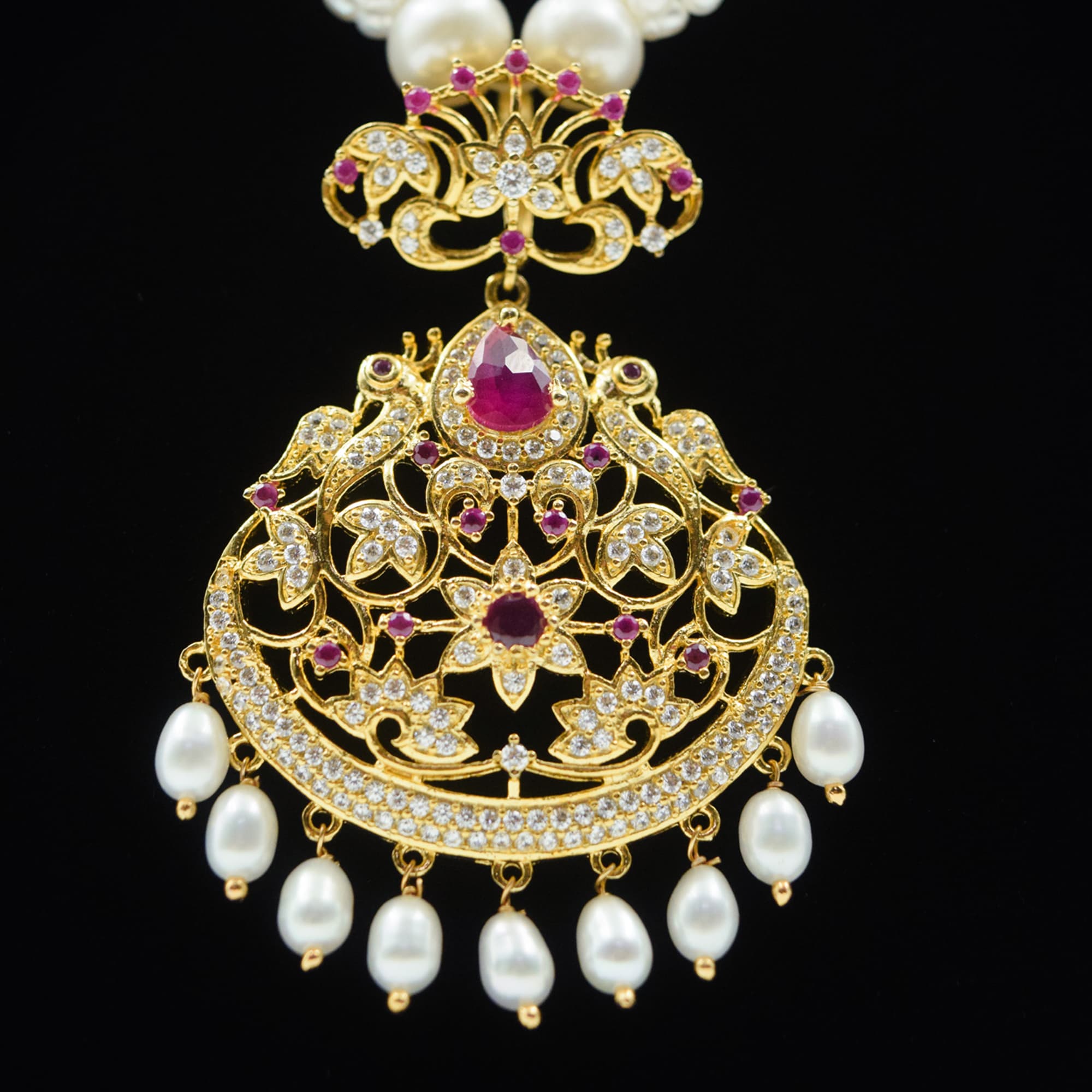 Regal White Rice Pearls Mala With Traditional SP Ruby & CZ Pendant