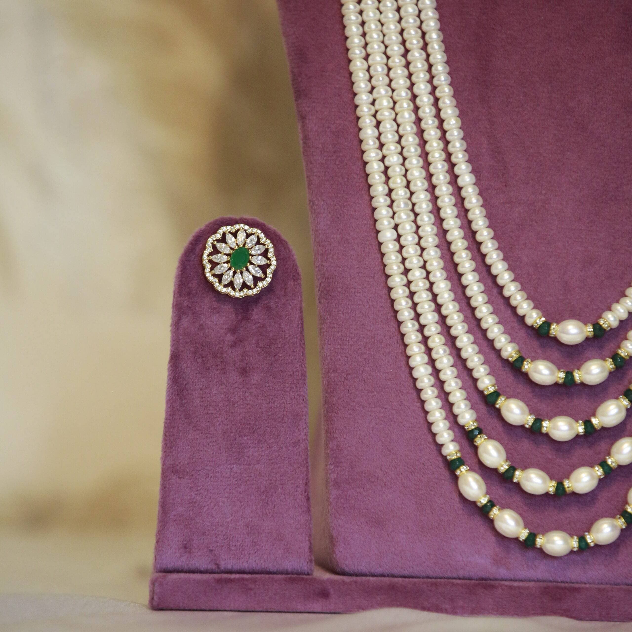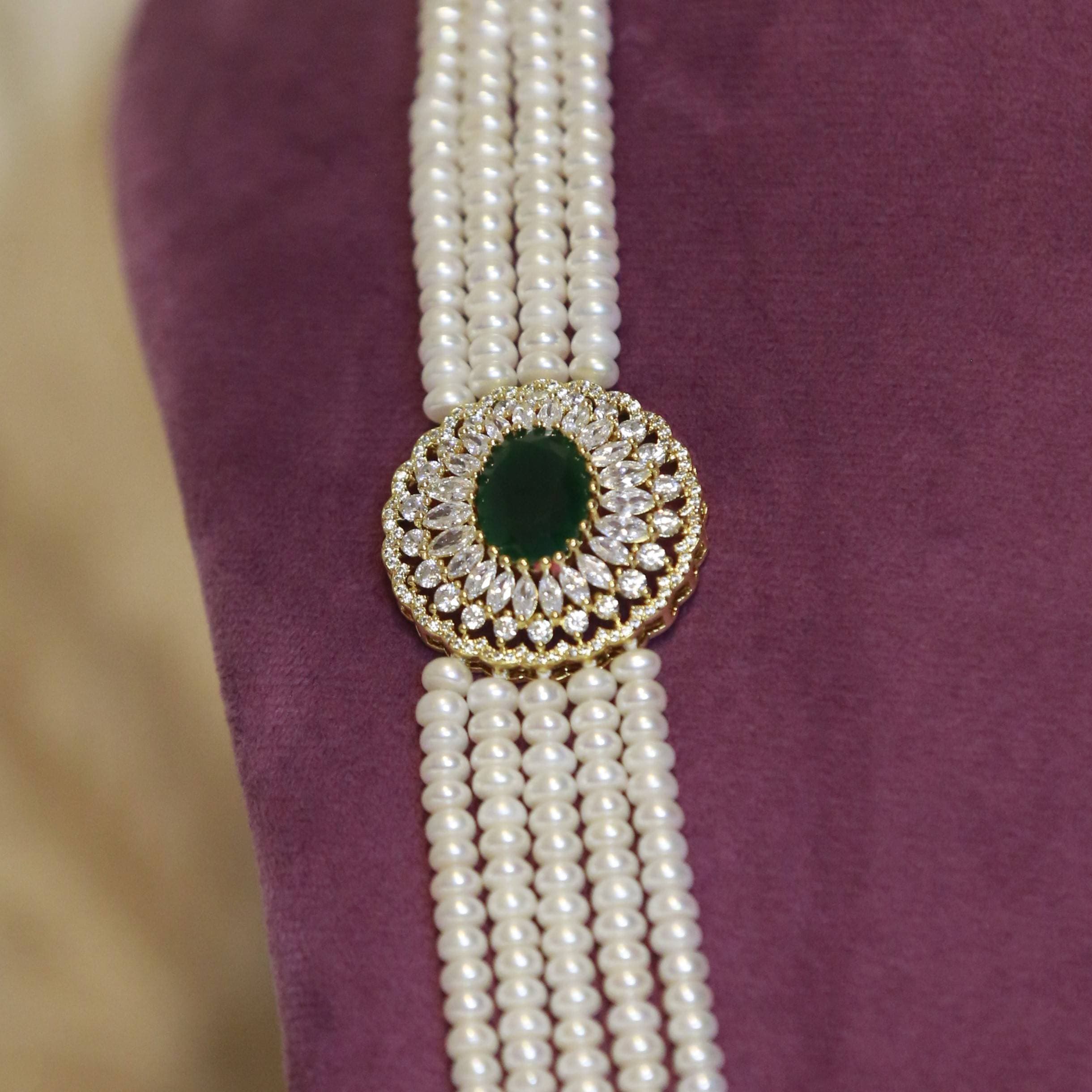 A very high-quality 29-inch long multi-layer pearl haaram in 5mm white semi-round pearls featuring beautiful side pendants embellished with zircons & SP emeralds.