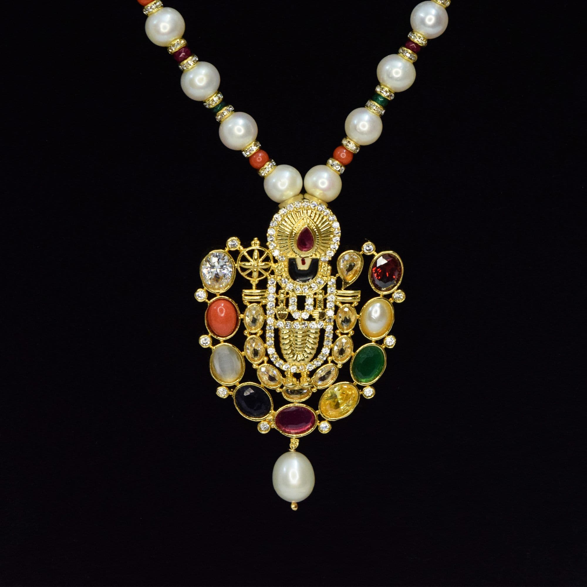Glossy 7.5mm round white pearls necklace with an artistic and divine navaratna pendant featuring Lord Balaji.