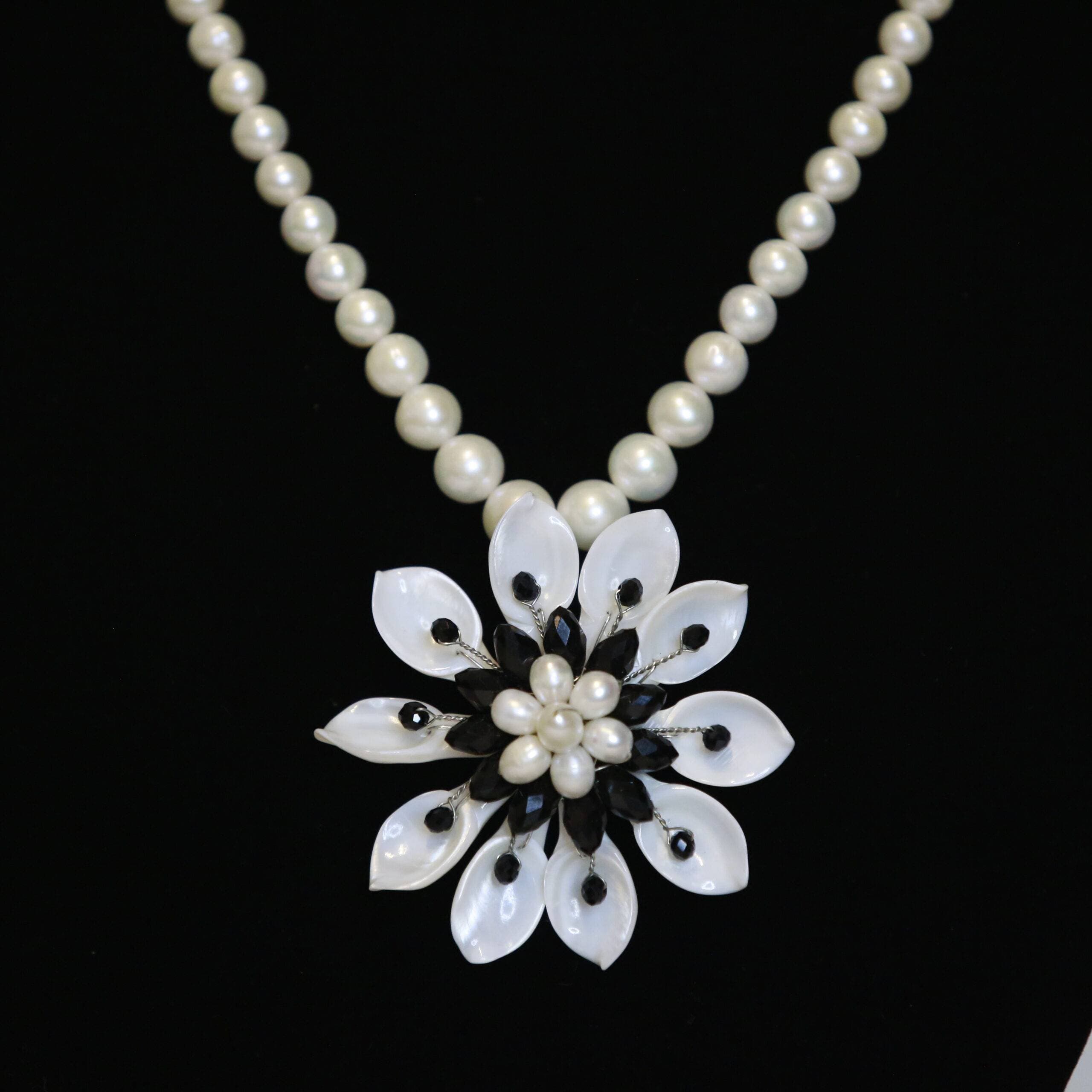A designer 18-inch long necklace featuring graduated white round pearls enhanced by a magnificent mother-of-pearl floral pendant.