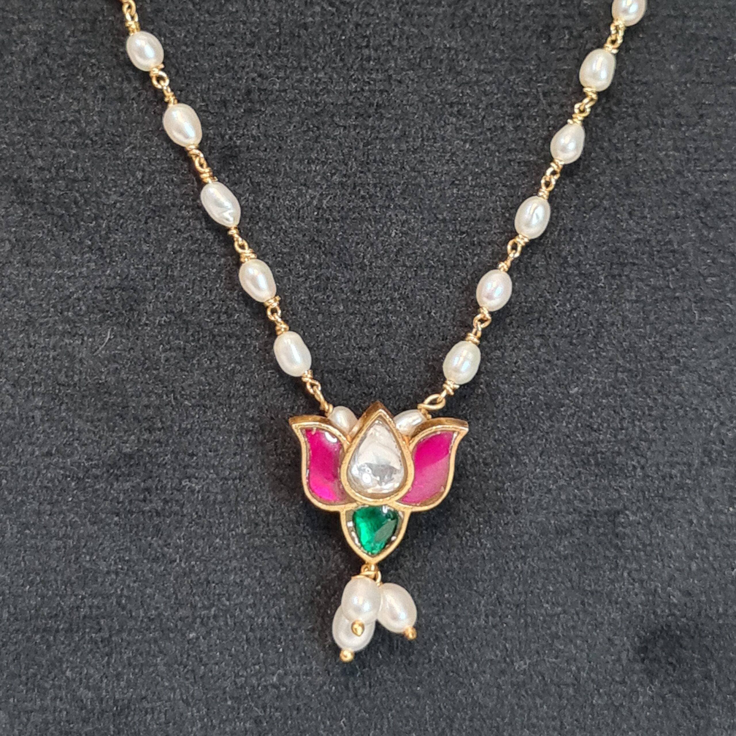 A well-crafted 19-inch long necklace featuring 3 mm white seed pearls taar mala necklace with a cute kemp studded lotus pendant.