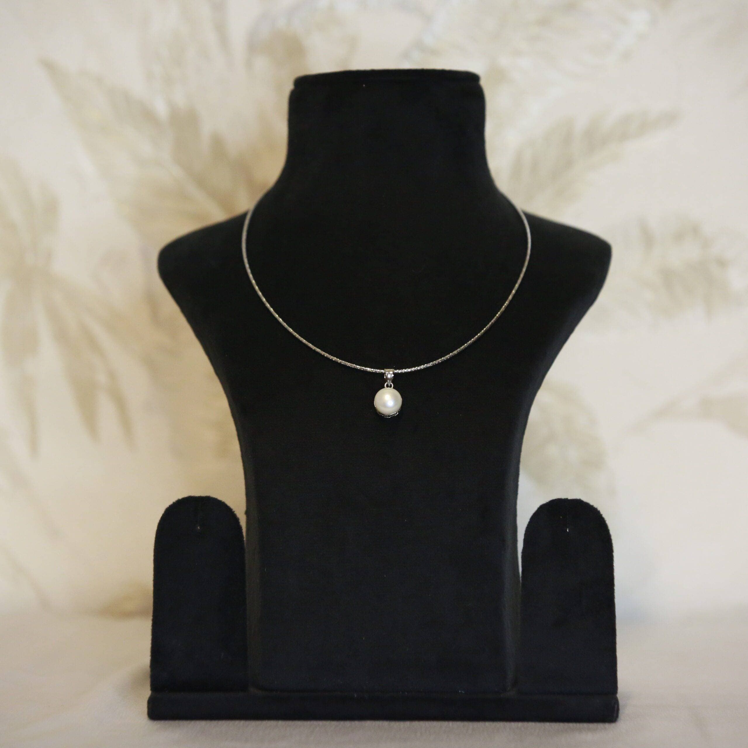 The pendant has an ornamented silver band that holds the 10.5mm white button pearl.