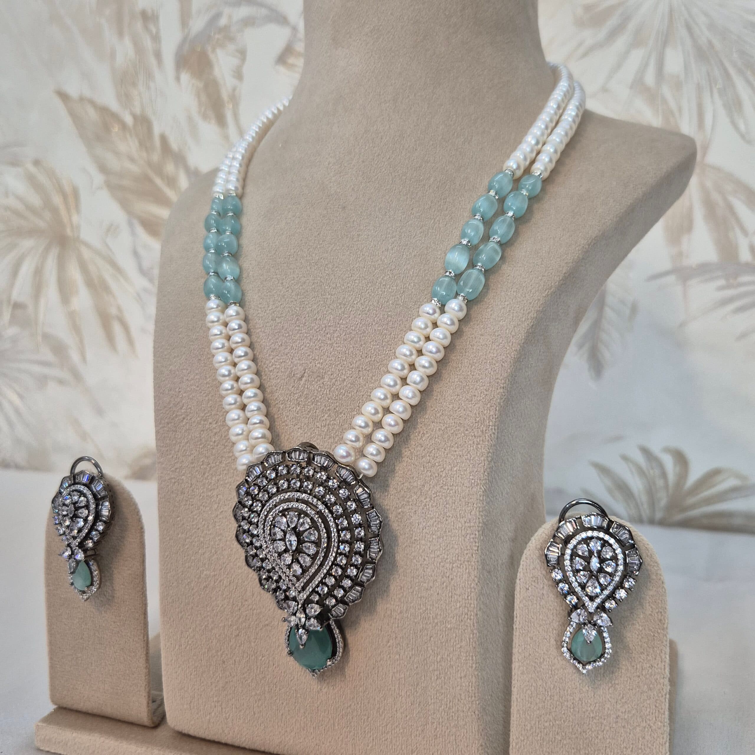 The sides of the necklace feature light turquoise beads with silver finish zircon studded roundels.