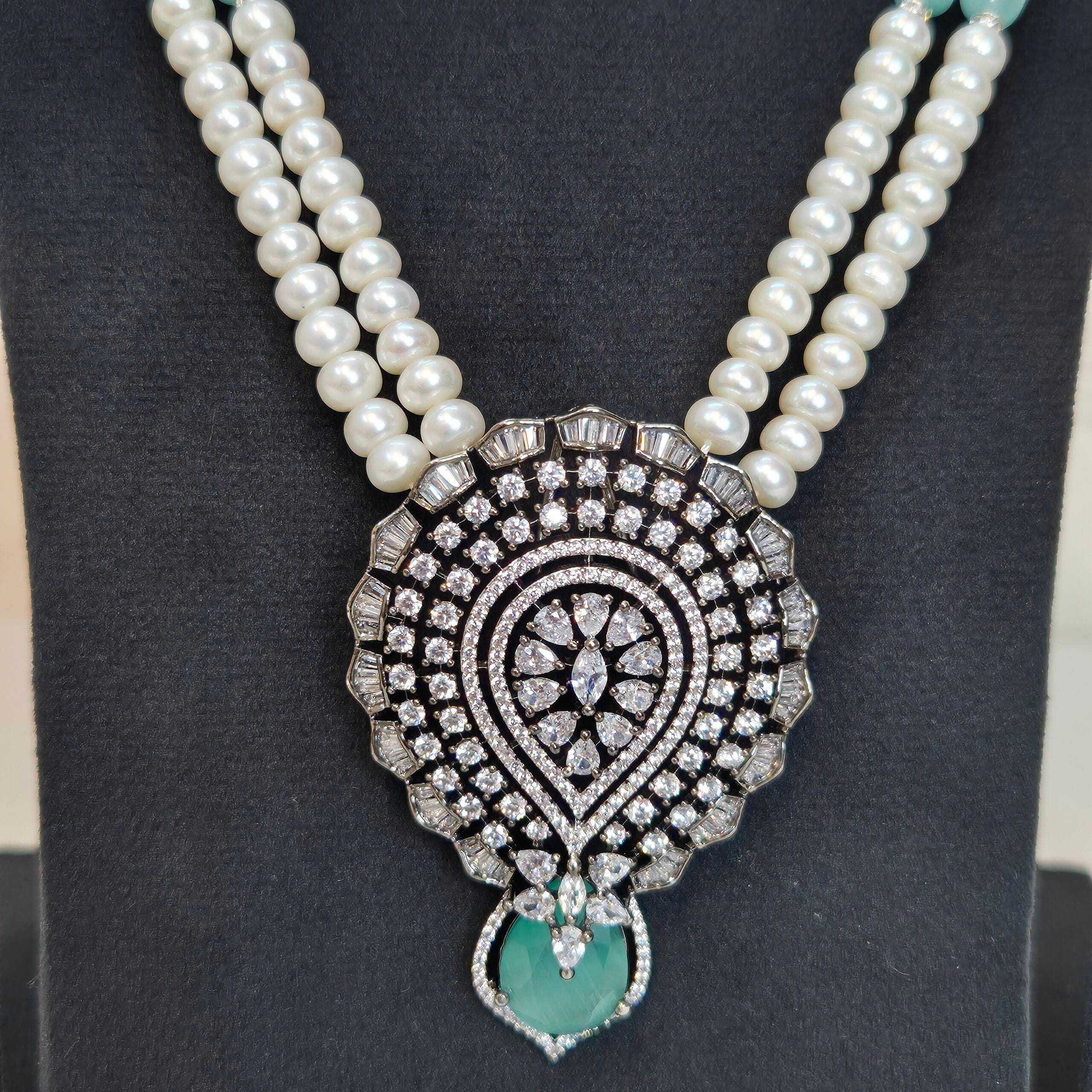 A limited edition designer two-row 19inch Long necklace featuring 6mm white semi-round pearls strung with turquoise beads and zircon studded roundels attached to a fabulous Victorian pendant that is studded with shiny CZ featuring large pastel green quartz in the centre.