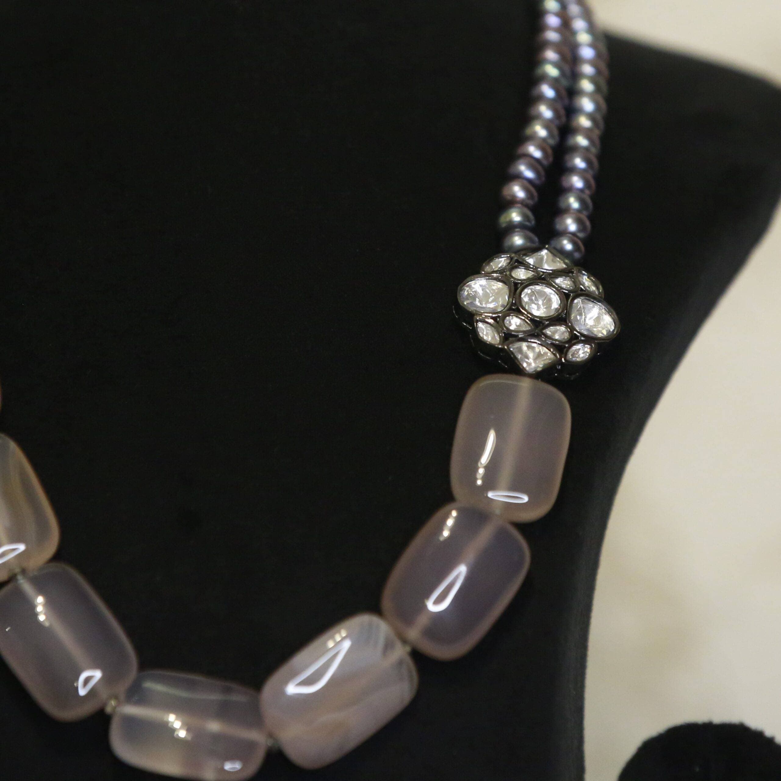 This necklace is a striking combination of large grey onyx complemented by bluish-grey pearls, creating a captivating piece of jewellery.