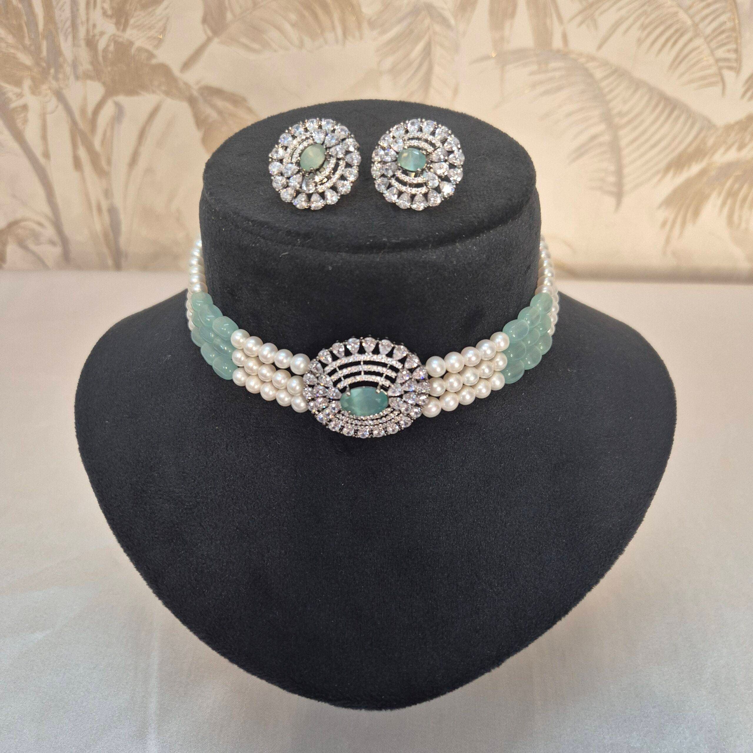 Stunning White Round Pearls Choker With Pastel Green Onyx Beads & CZ Pendant