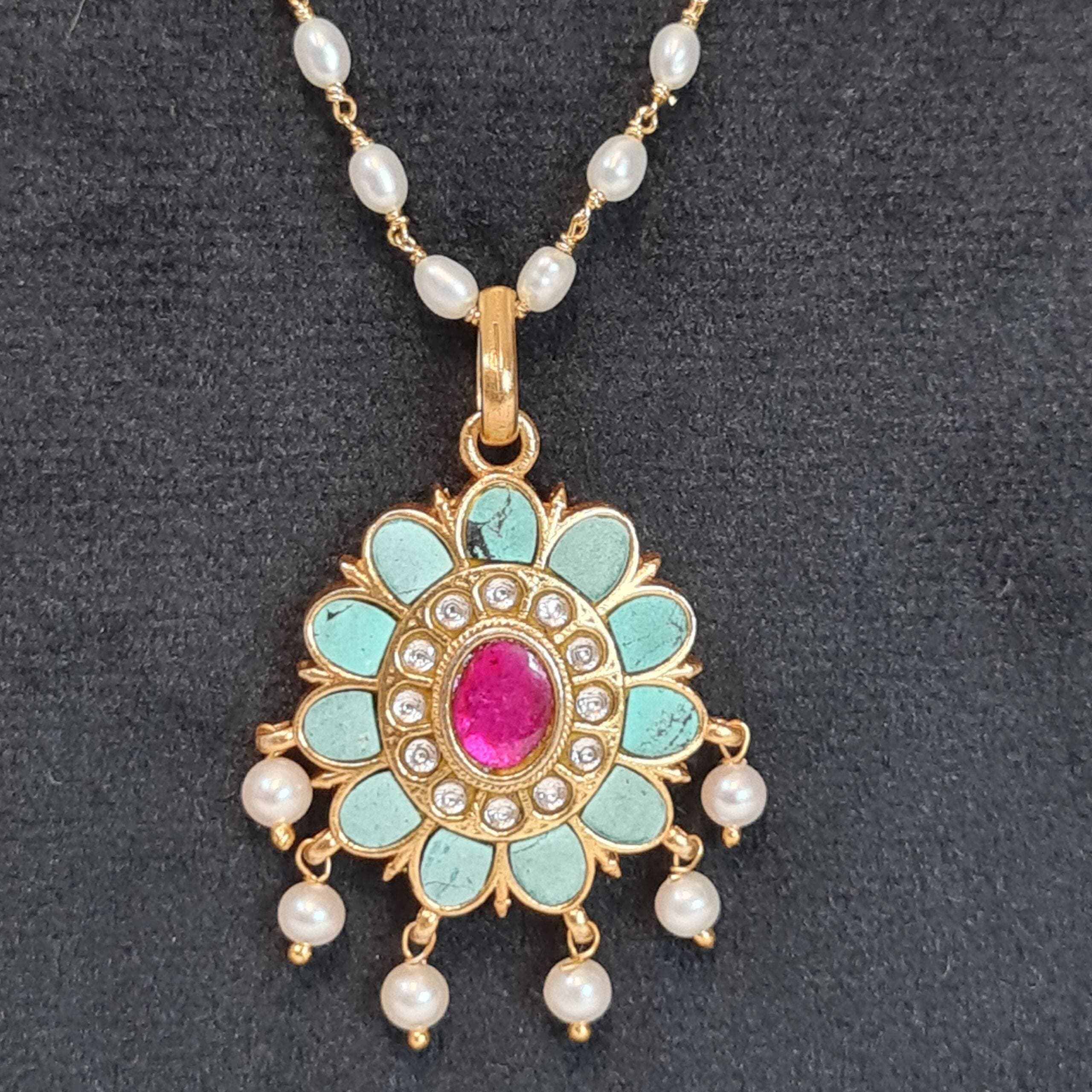 The medium-sized floral pendant is studded with elegant turquoise petals studded around pink & white kemp stones.