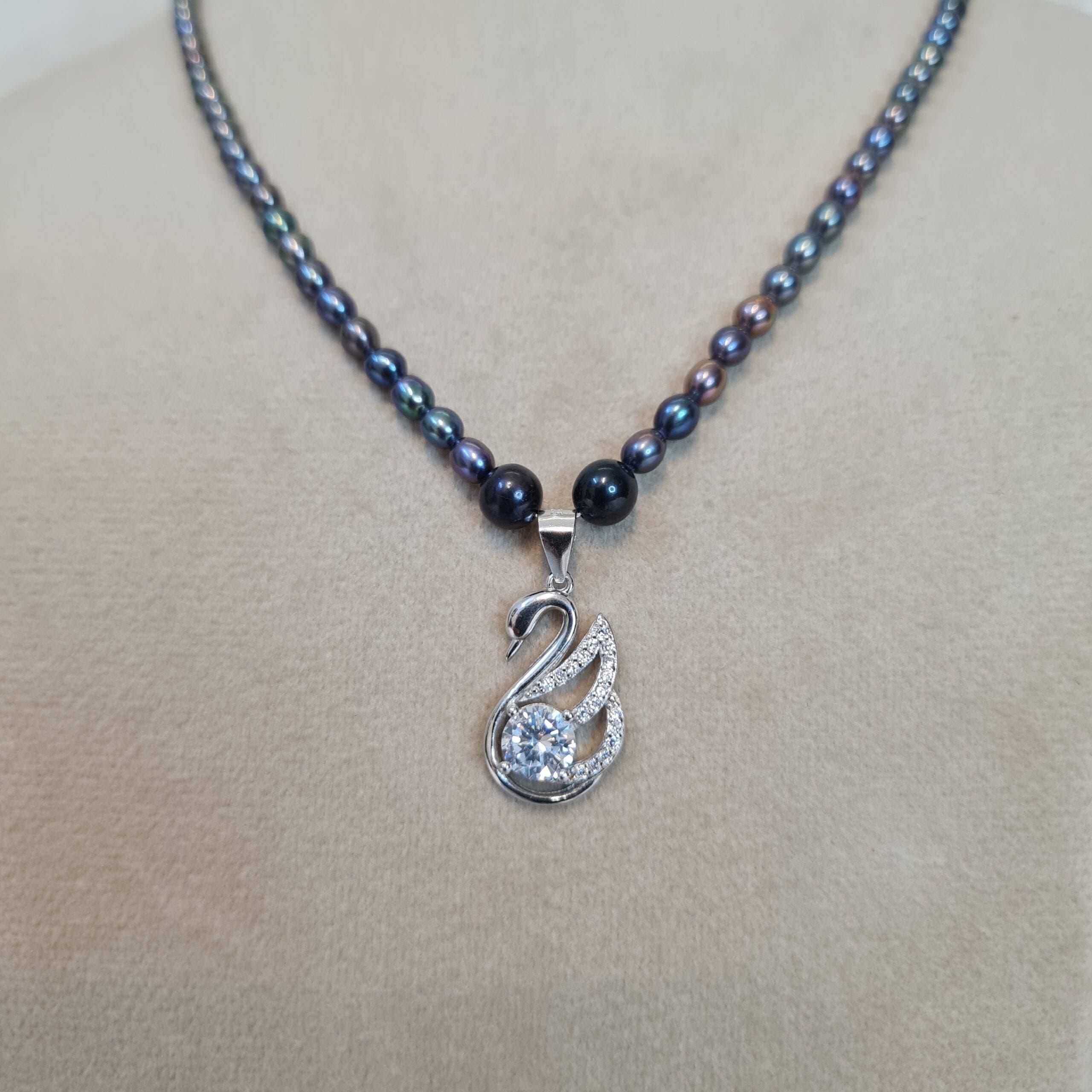 A 17-inch long necklace featuring 3.5 mm oval pearls strung with a cute swan pendant made in 925 silver.