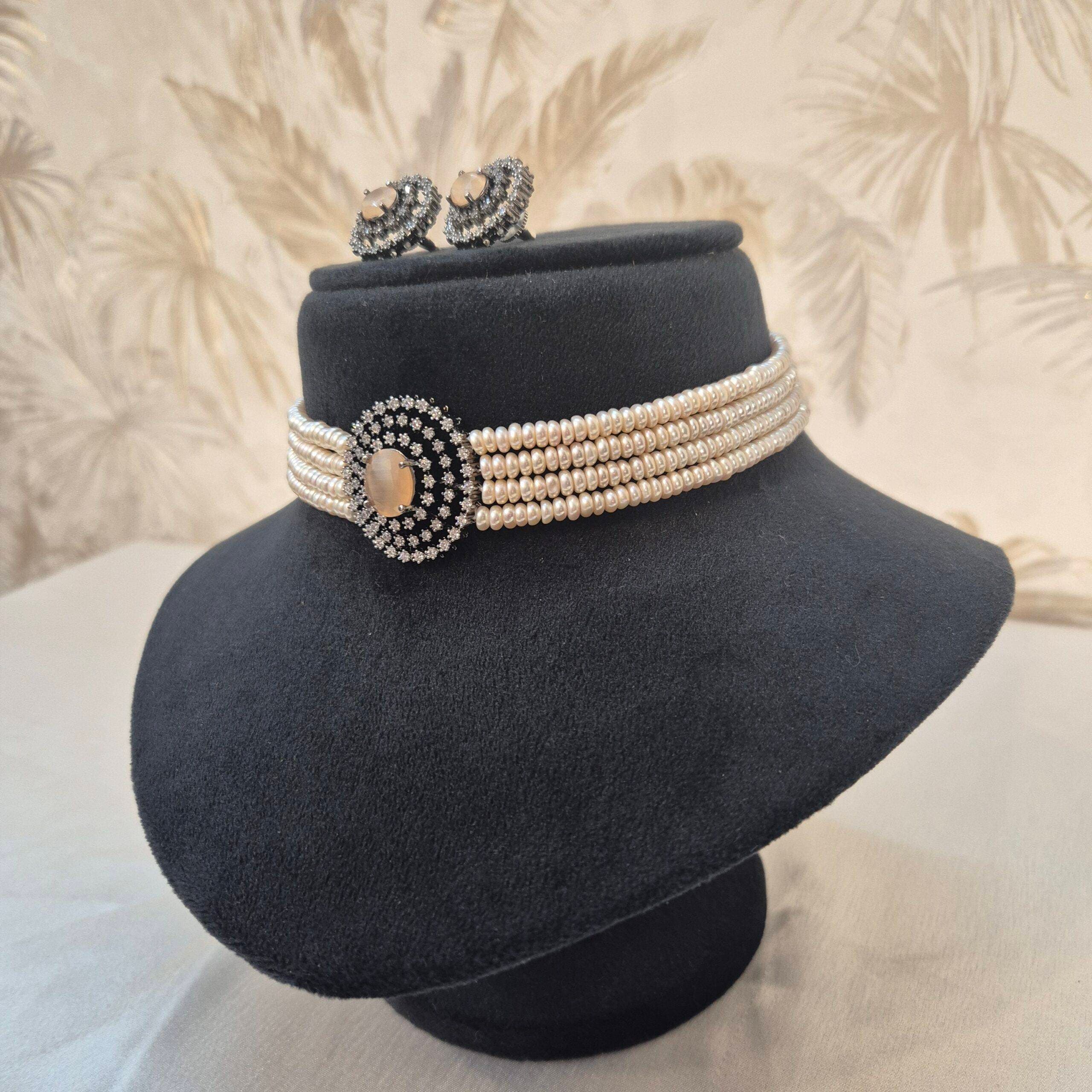 A designer handmade 4-line choker with radiant 4.5mm peach semi-round pearls attached to a graceful Victorian pendant studded with shiny zircons & peach quartz in the centre.
