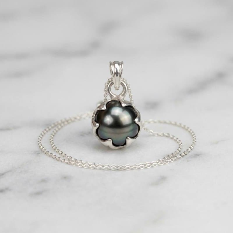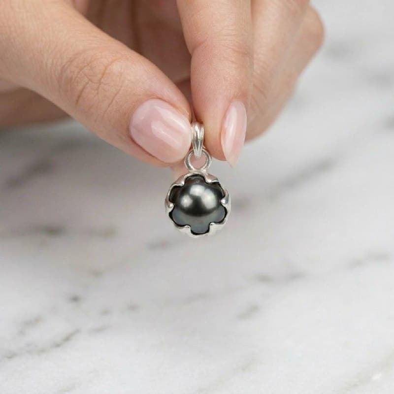 This pendant features a single Tahitian pearl with a rich, dark lustre, held securely in a sterling silver setting without drilling the pearl. This preserves the pearl's natural integrity and structure, keeping it whole and unaltered.