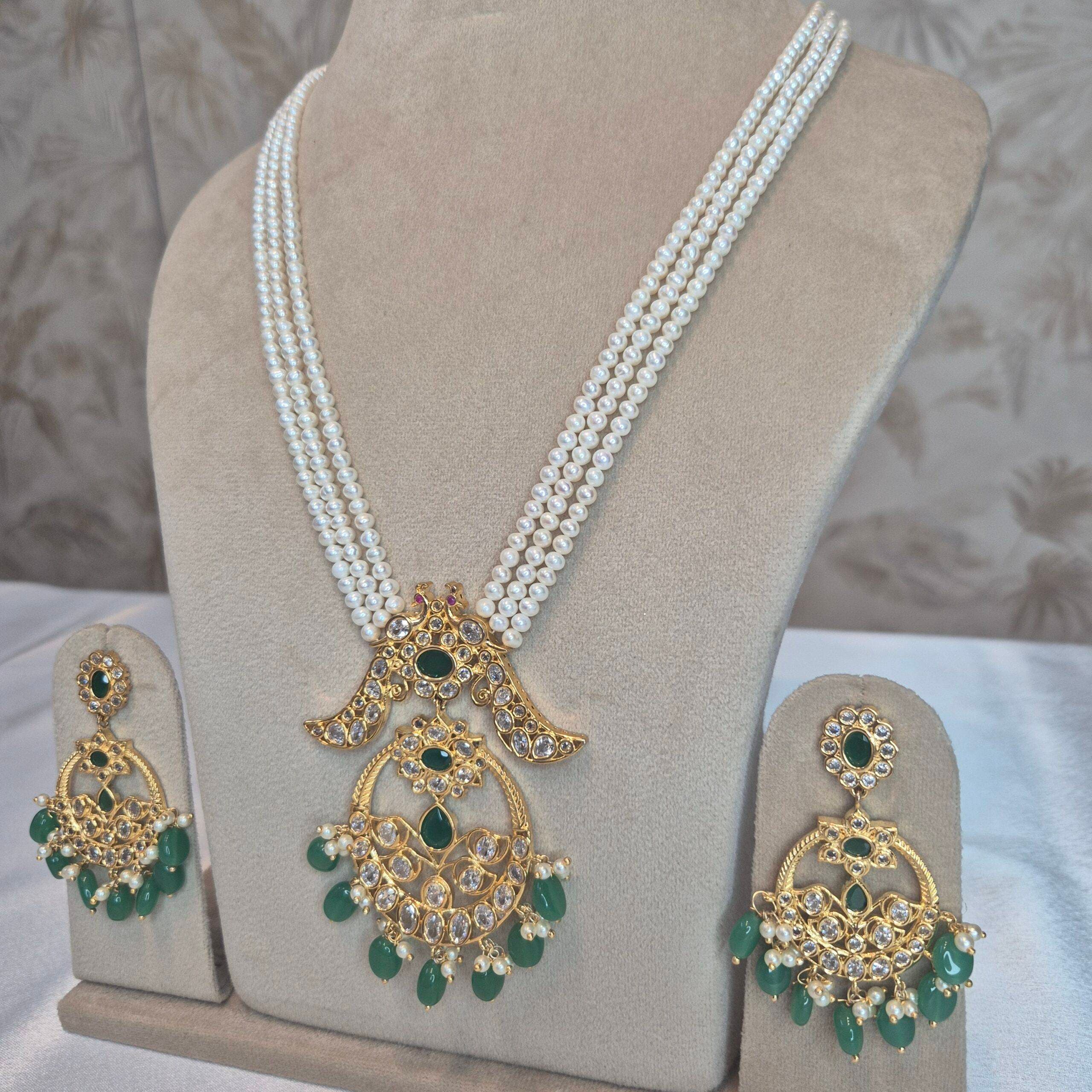 A beautiful handmade triple-line 20-inch long necklace made with lovely 4mm shiny white round pearls accentuated by an exquisite polki studded pendant with green onyx beads.