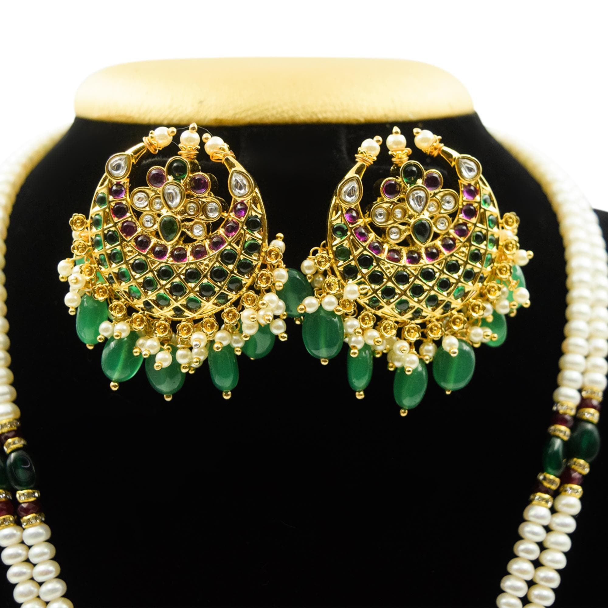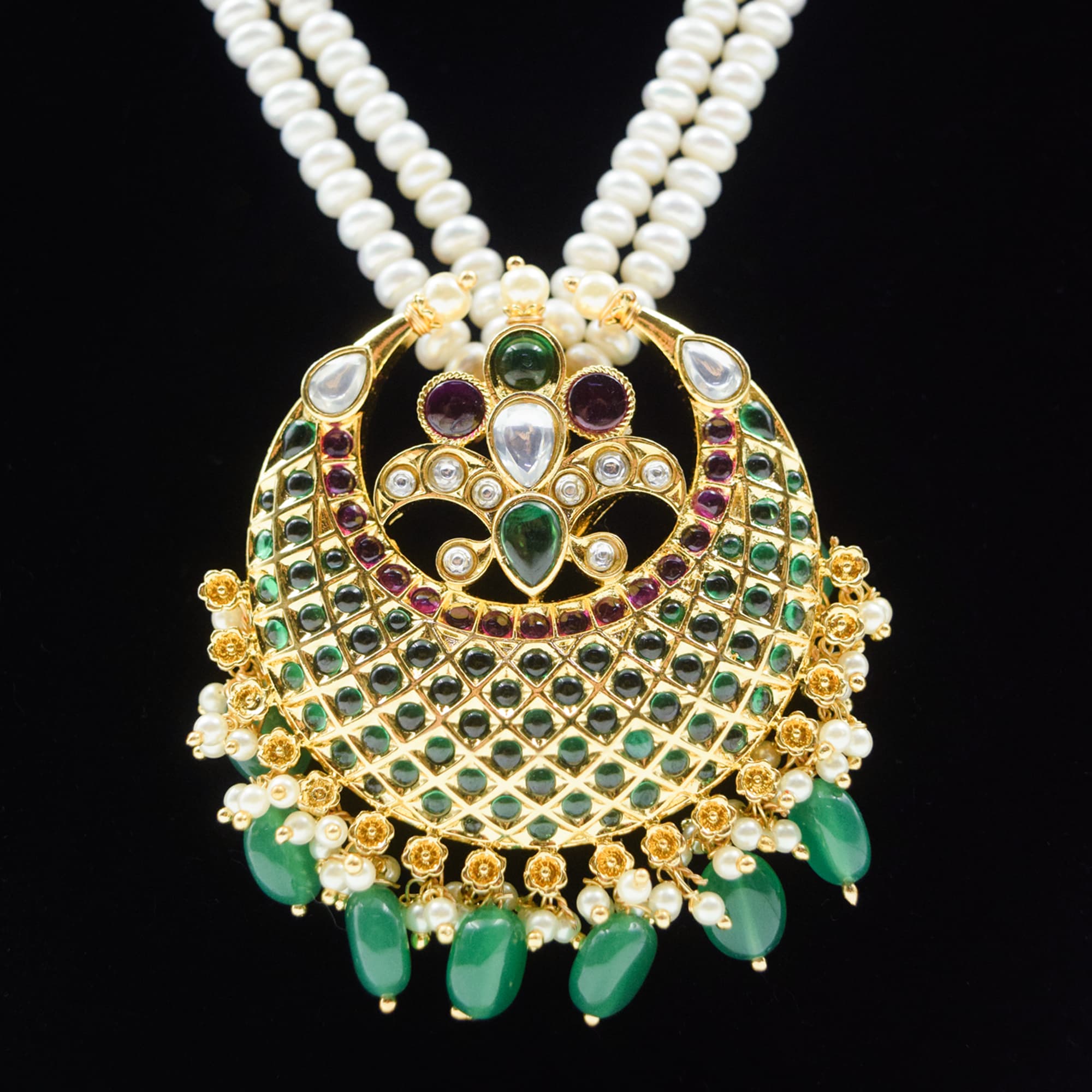 Traditional Double-Line Pearls Haar With SP Emerald Chaand Bali Pendant