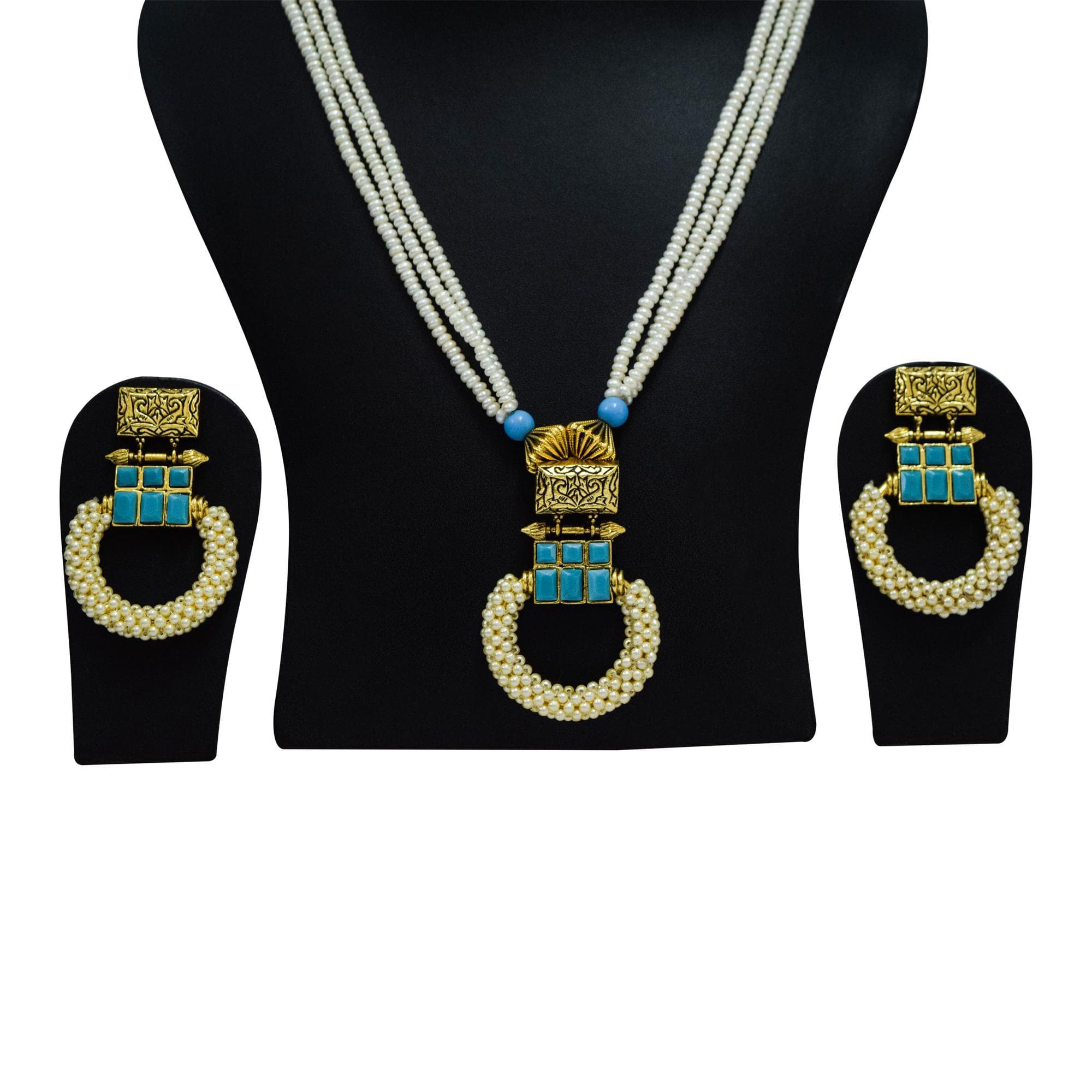 Pendant And Earrings are made in brass, micro plated with gold colour. A special type of treatment is done after gold colour plating so that this set will not turn black (or lose shine) for a very long time.