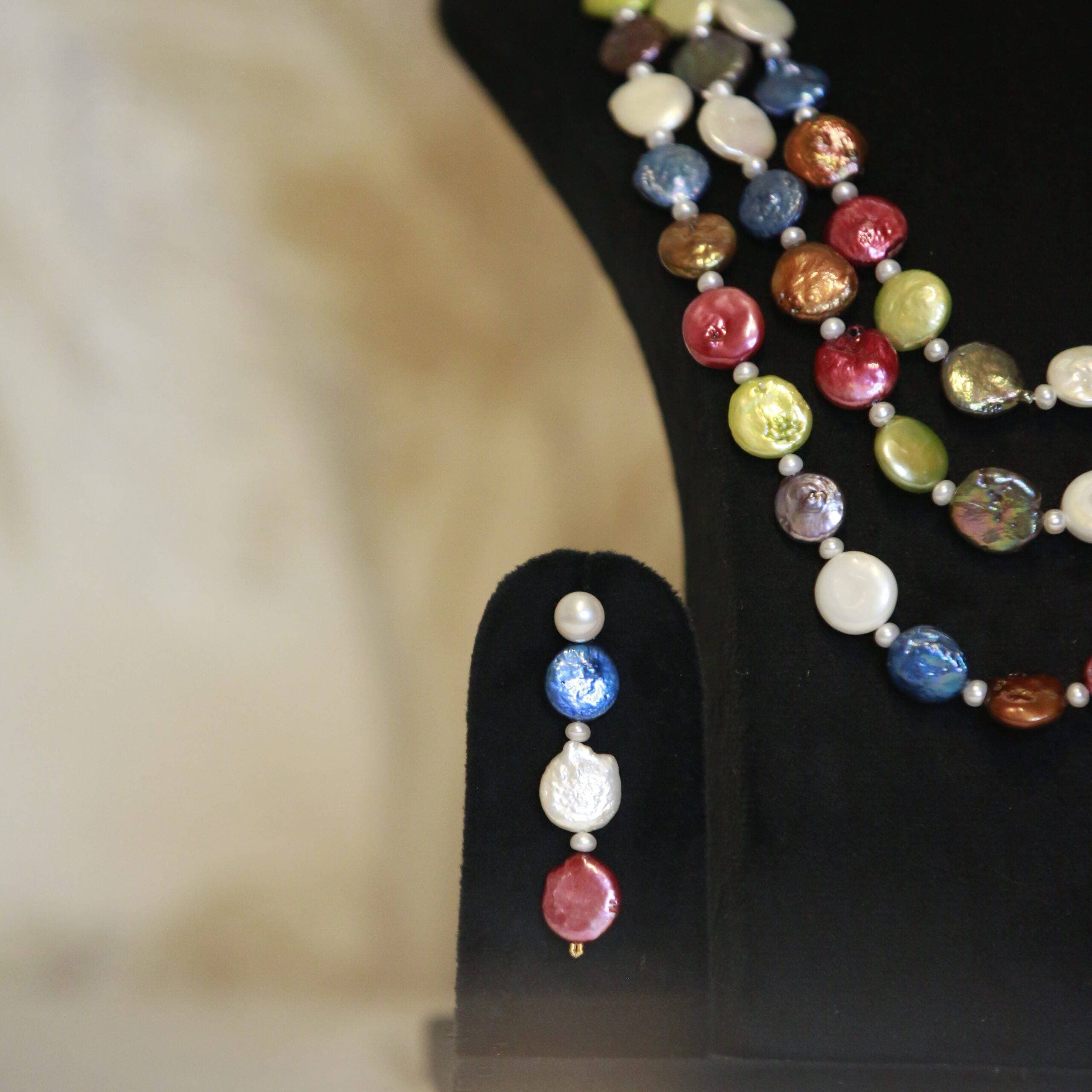 A well-crafted 3 row 21-inch long necklace featuring lovely multicoloured coin-shaped pearls interspaced with white seed pearls.