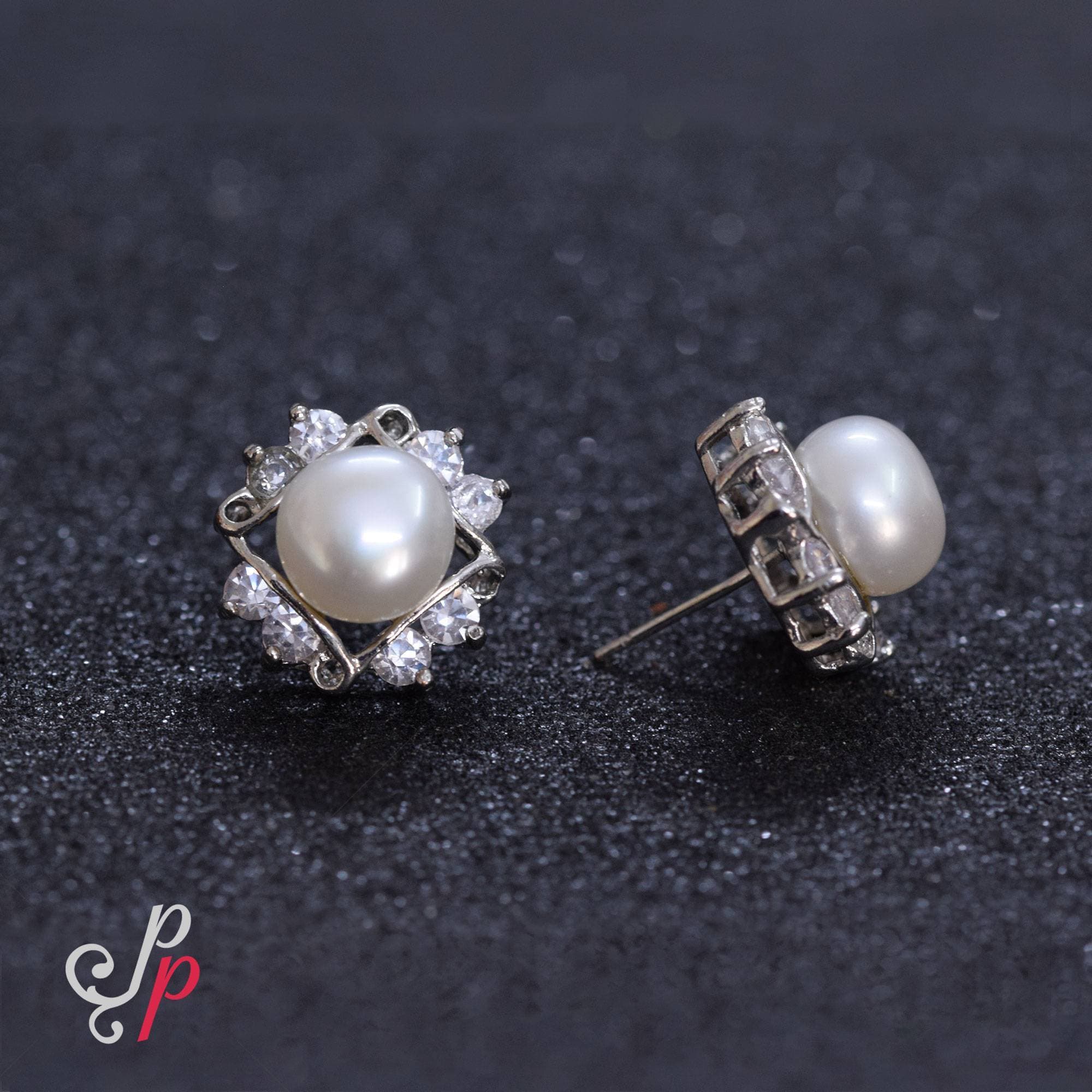 White pearl Studs with Beautiful American Diamonds