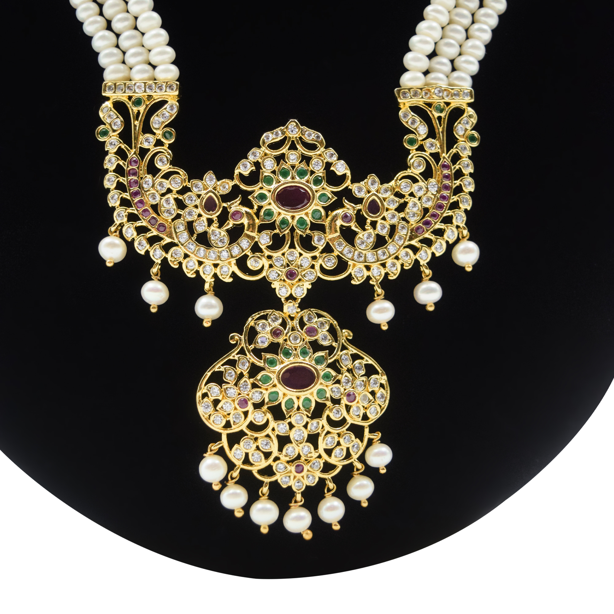 Grand triple row white pearls with a splendid traditional peacock pathakam studded with zircons, SP rubies & SP emeralds.