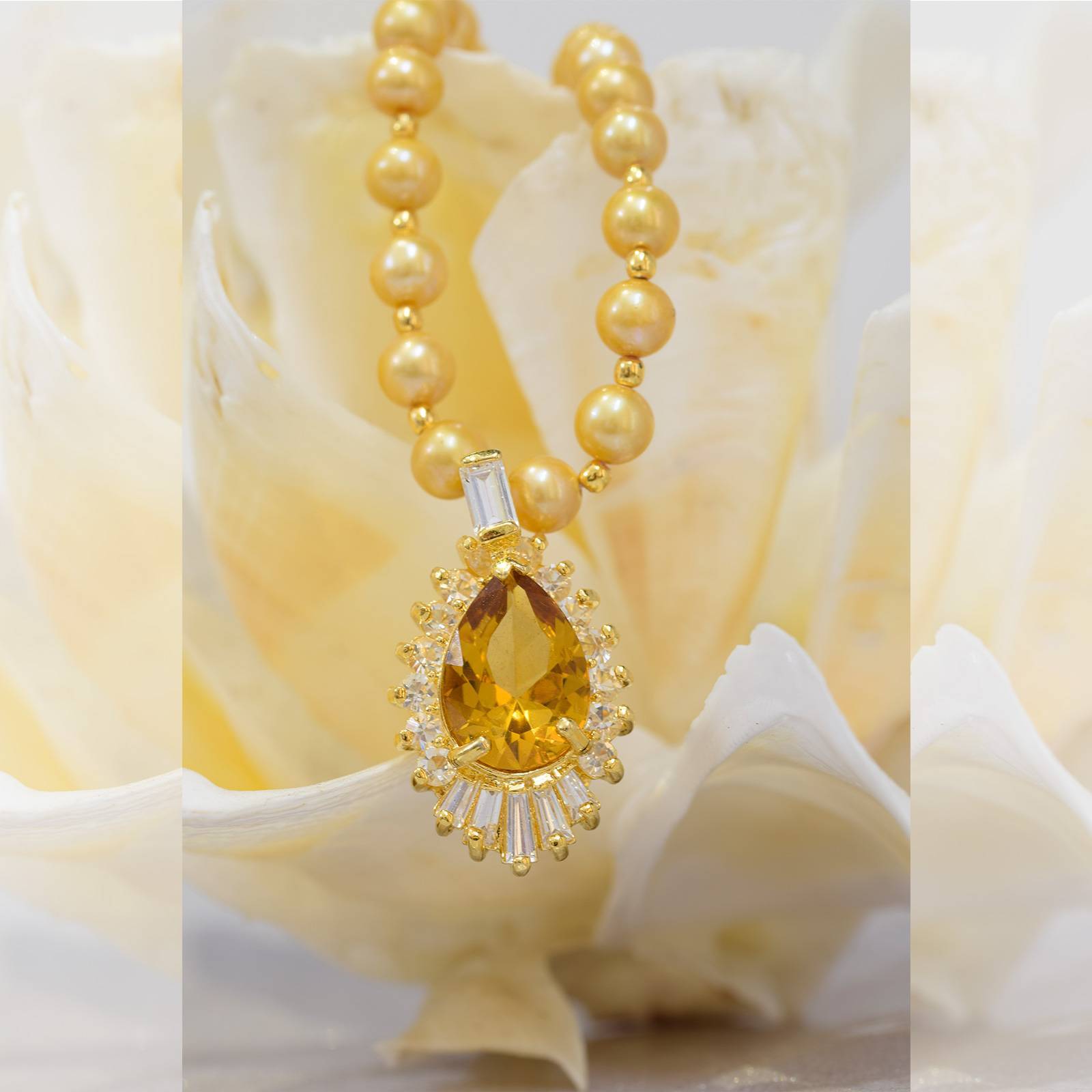 Pearl Necklace Set in Dark Golden Coloured Pearls and Topaz Like Stone Pendant